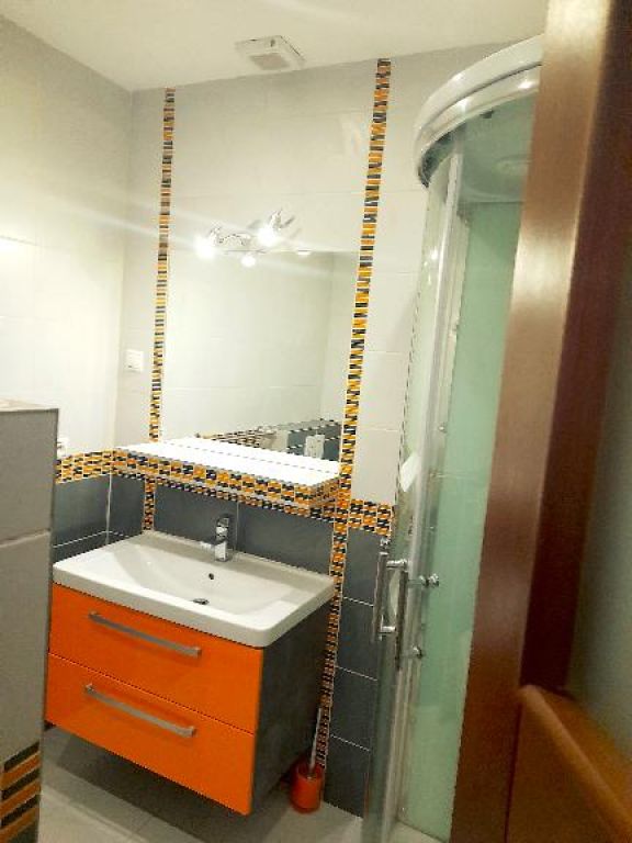 Dolná kúpeľňa: umývadlo, sprchový kút a WC.