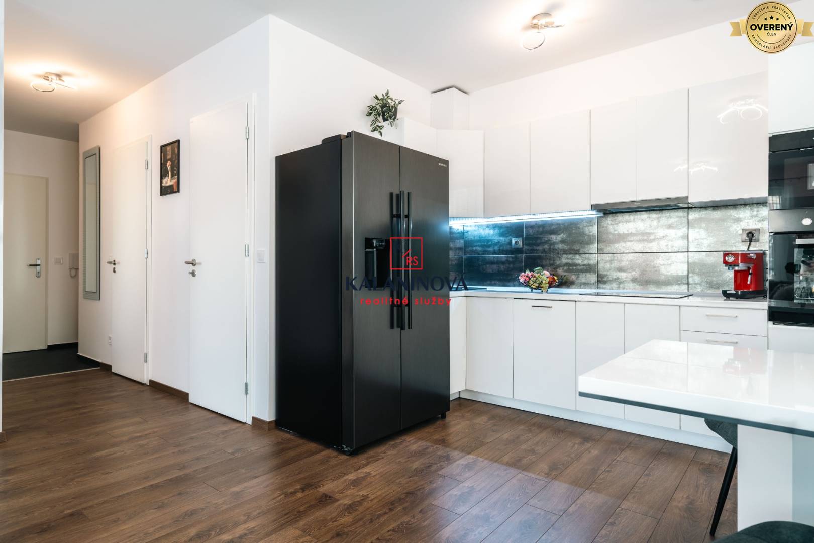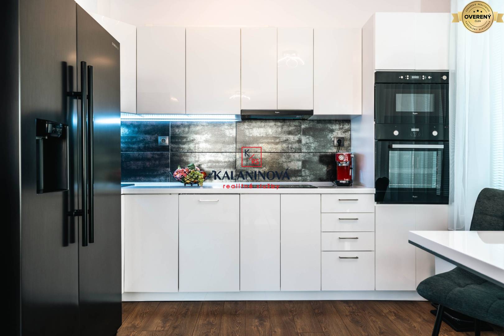 Kuchynská + jedálenský časť – kuchynská linka do tvaru „L“, kompletné vybavenie kuchyne, vrátane dizajnového kávovaru, vstavané spotrebiče (indukčná varná doska, elektrická rúra, mikrovlnná rúra, digestor, umývačka riadu), americká chladnička s mrazničkou a s výrobníkom ľadu, jedálenský stôl + 2 stoličky.