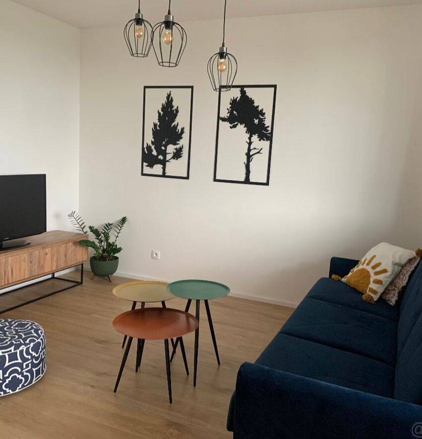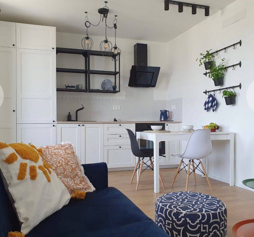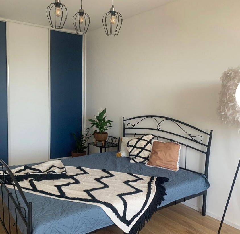 Kuchyňa je spravená na mieru v bielej farbe a vo vintage štýle a prepojená s obývacou izbou, ktorá je kopmpletne zariadená. Spálňa je s manželskou posteľou a vstvanou skriňou. Vstup na balkón je zo spálne aj z obývačky. Byt sa prenajíma kompletne zariadený