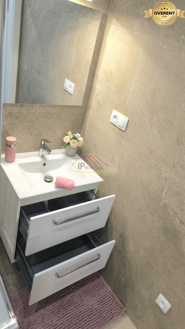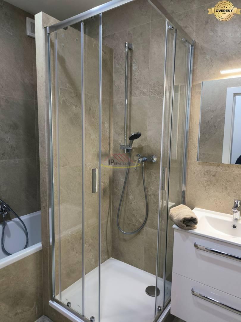 - hneď vedľa WC je samostatná kúpeľňa, ktorá je vybavená vaňou, sprchovým kútom umývadlom, skrinkou pod umývadlom, moderným zrkadlom,