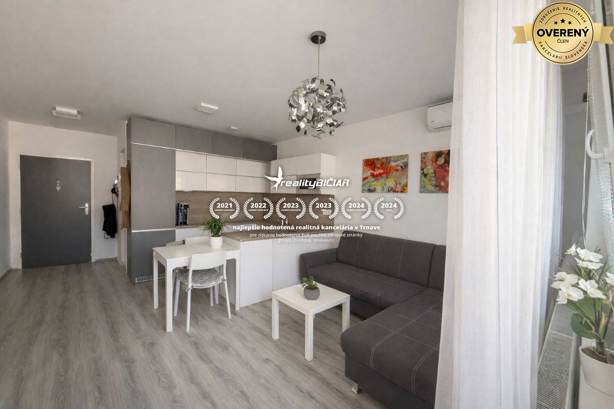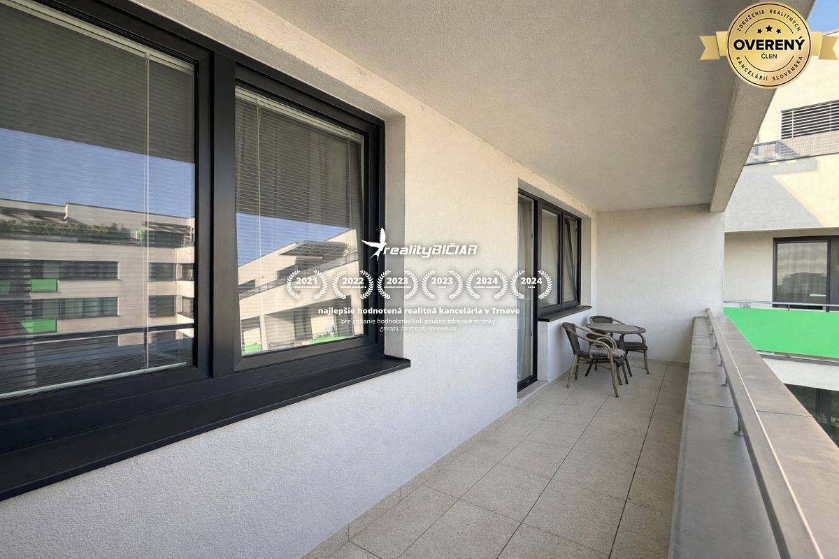 REZERVOVANÉ! Ponúkame na predaj klimatizovaný, kompletne zariadený 2-izbový byt s celkovou výmerou 55,98 m², doplnený o samostatný priestranný šatník o výmere 3,63 m² a veľkú lodžiu o výmere 9,32 m². Byt sa nachádza na 5. nadzemnom podlaží moderného bytového domu a je orientovaný do pokojného vnútrobloku, čo ocenia najmä rodiny s deťmi, keďže majú bezpečný výhľad na vnútorný priestor.
