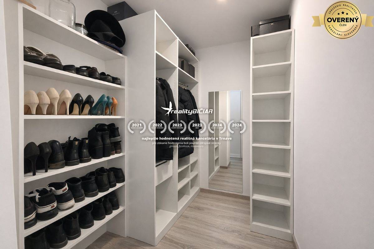 Dominantou dennej časti je kuchynská linka vyhotovená do tvaru U, vybavená modernými vstavanými spotrebičmi a dostatkom úložného priestoru. V byte sa nachádzajú vstavané skrine vyhotovené na mieru, ktoré poskytujú komfortné riešenie pre uskladnenie oblečenia a ďalších vecí. Veľkým benefitom je samostatný šatník, ktorý je vybavený policovým systémom a úložnými priestormi na oblečenie, topánky aj doplnky.