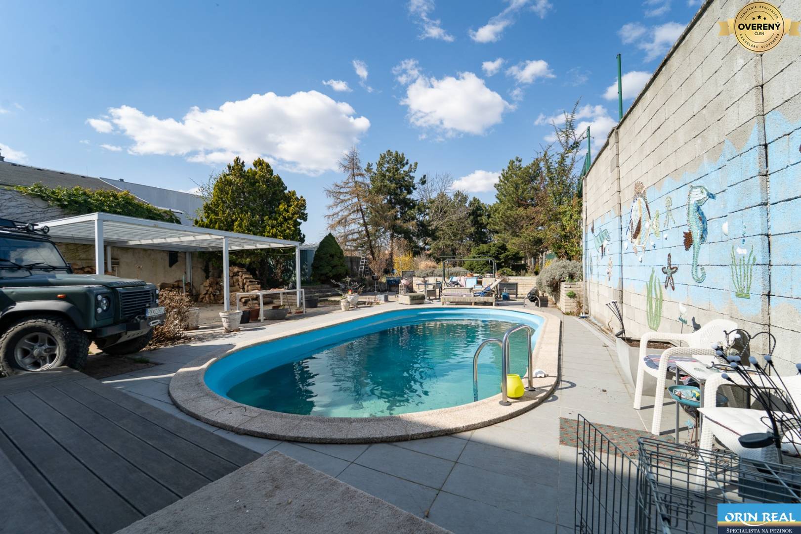 Táto elegantná nehnuteľnosť predstavuje ideálne spojenie komfortného bývania, súkromia a veľkorysého priestoru. Vila je situovaná na krásnom pozemku o výmere takmer 1700 m², ktorý poskytuje dostatok zelene, oddychu aj príjemnú atmosféru rodinného bývania. Dominantou záhrady je veľký bazén, upravená zeleň s vysadenými borovicami a nádherný výhľad smerom na Malé Karpaty.