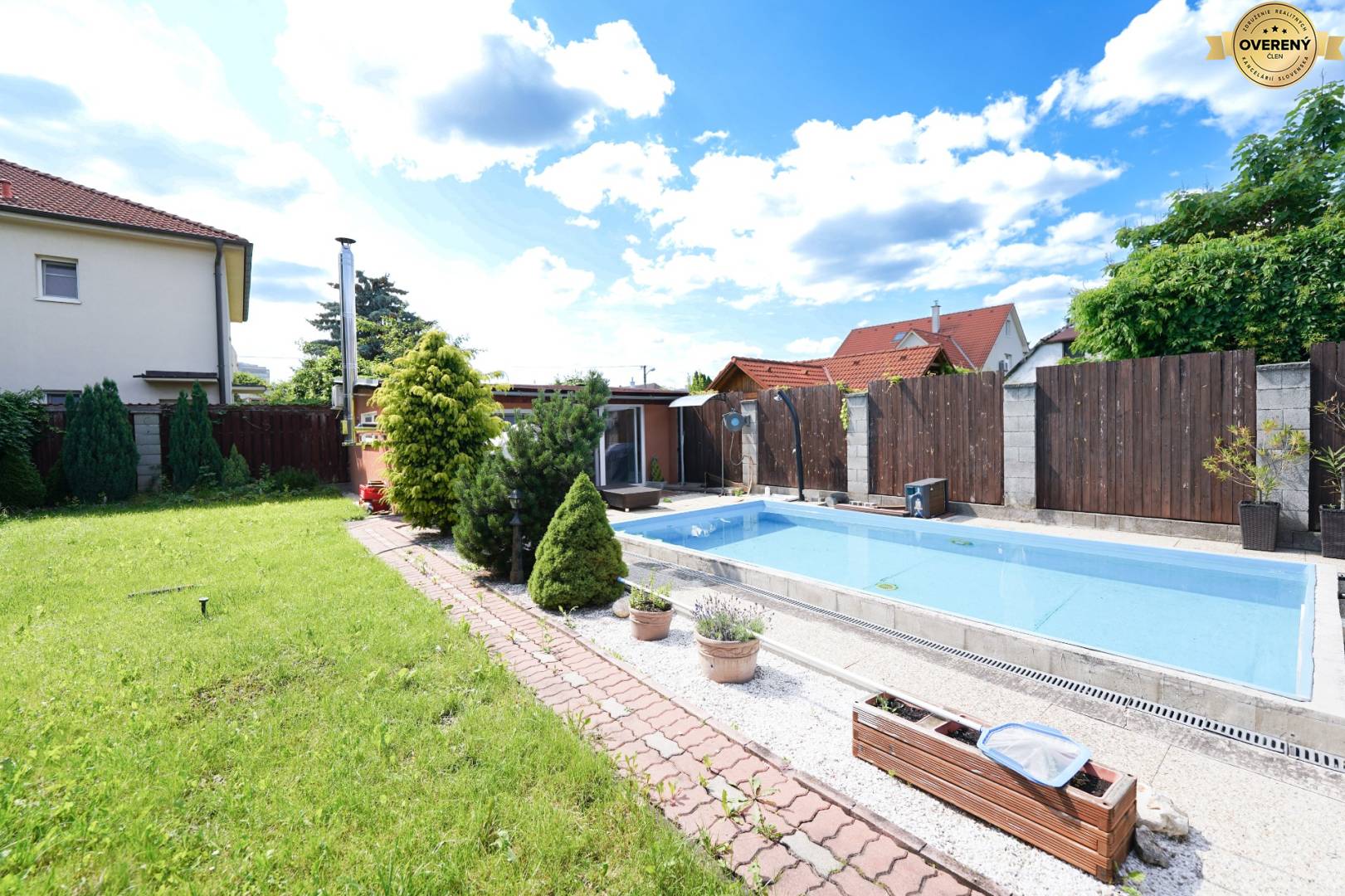 Tento dvojpodlažný rodinný dom s úžitkovou plochou 95 m2 stojí na pozemku o výmere 360 m2, z toho zastavaná plocha domu je 75 m2. Súčasťou nehnuteľnosti je letný domček 25 m2, pivnica 14,06 m2 (pod parkovacím státím vedľa domu vo dvore) a exteriérový bazén 7x4 m s hĺbkou 1,5m.