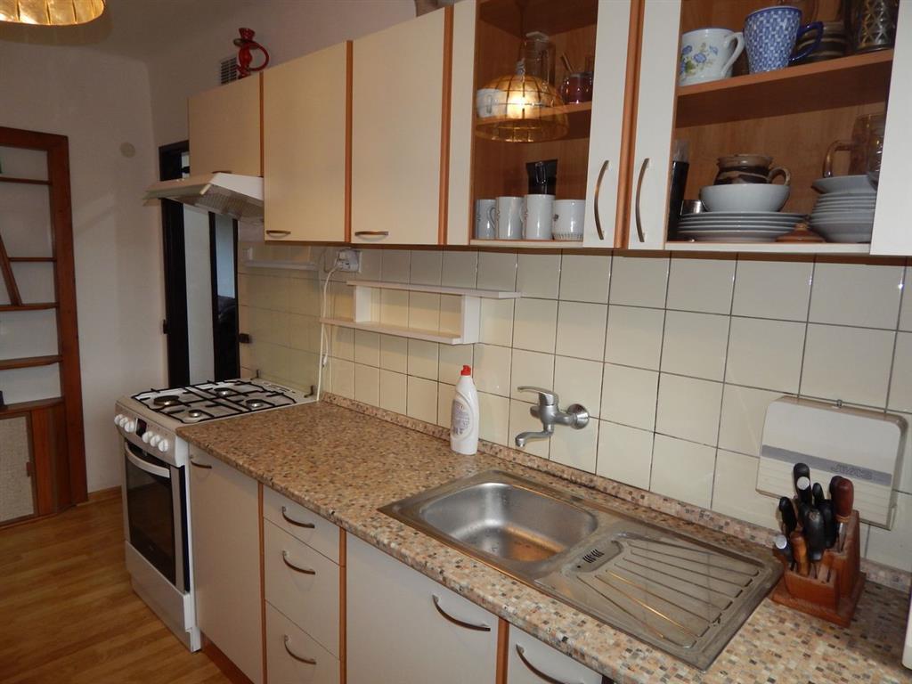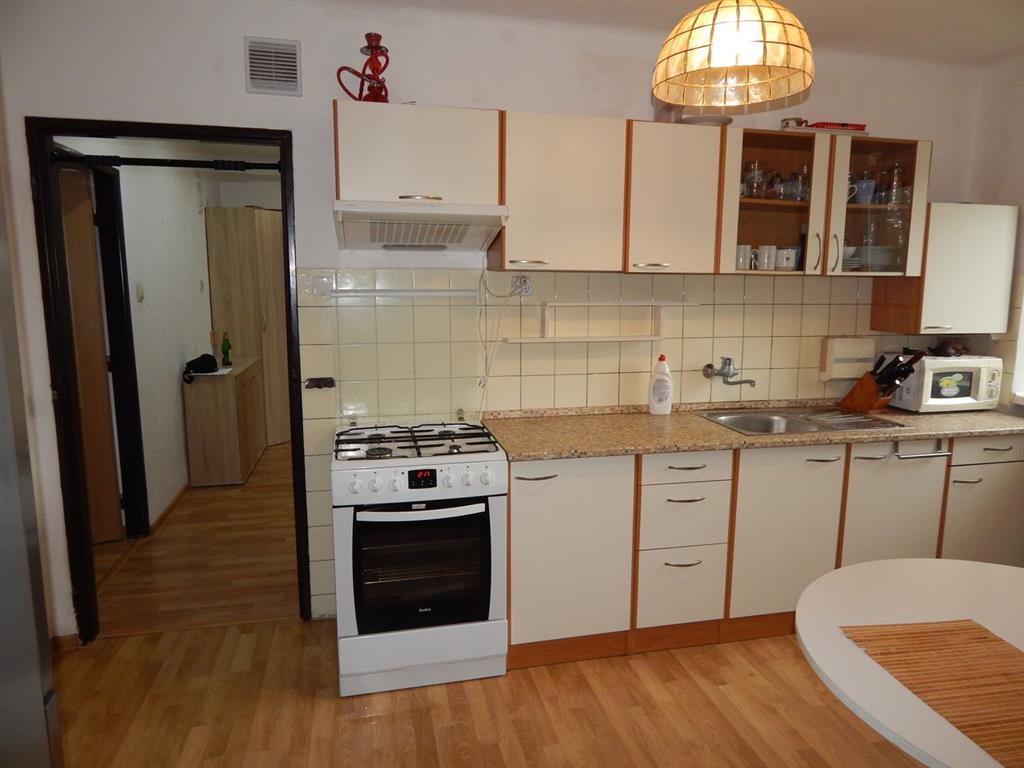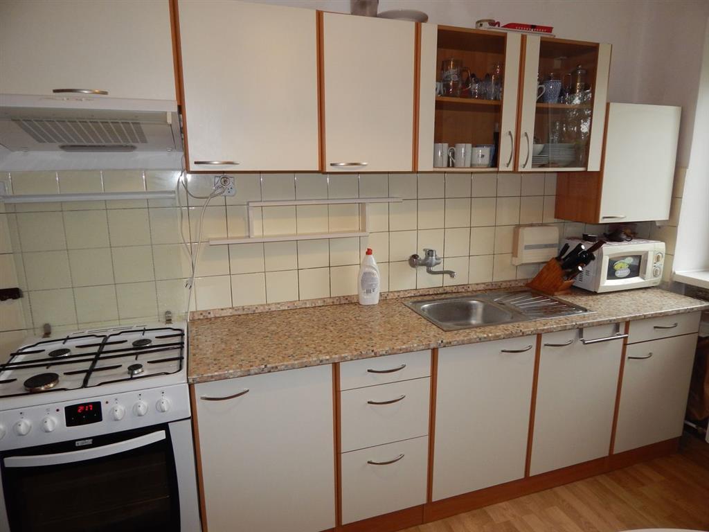 - Výbavou bytu je nová kuchynská linka na mieru s nerezovým drezom, s kombinovaným sporákom, digestor, chladnička, mikrovlnka.