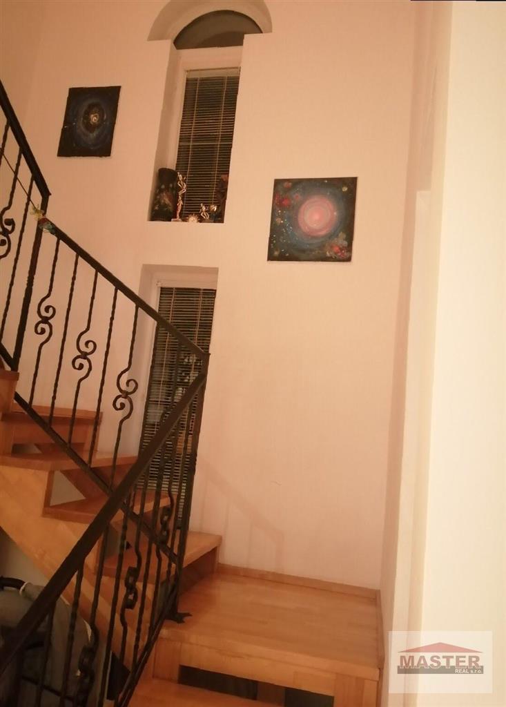 Z prízemia vedie drevené schodisko na druhé podlažie, vyrobené z bukového dreva a je kombinované s kovaním.
