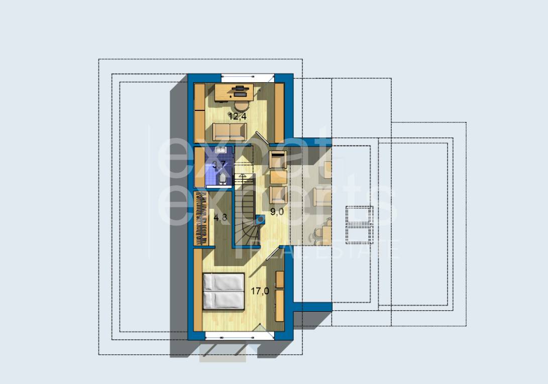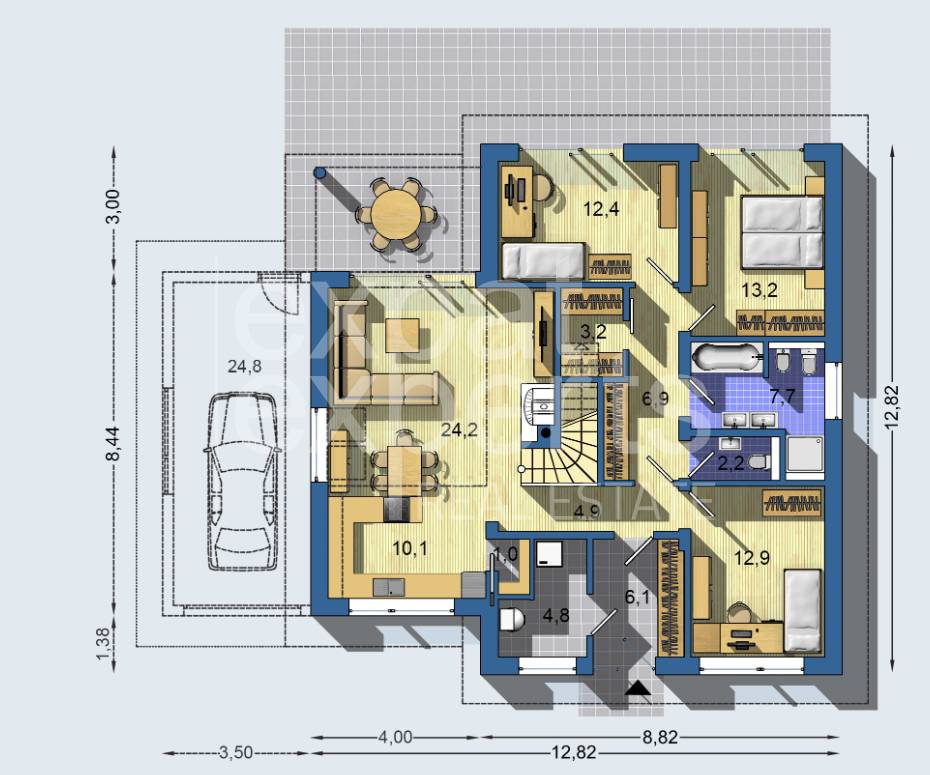 Maximálne rozmery zastavanej plochy sú 12,810 x 12,020 m, úžitková plocha 139,8 m2, obytná plocha 79,5 m2. Celková podlahová plocha je 128,0 m2.