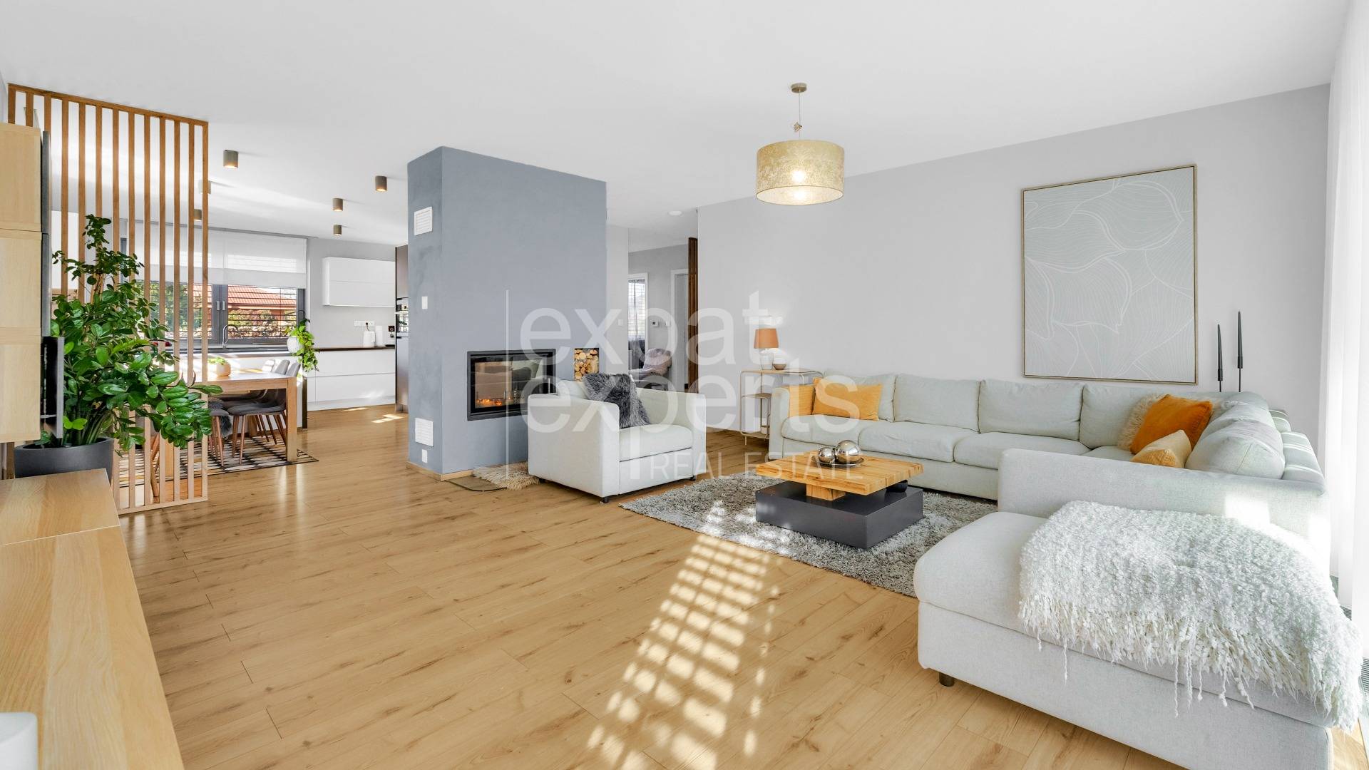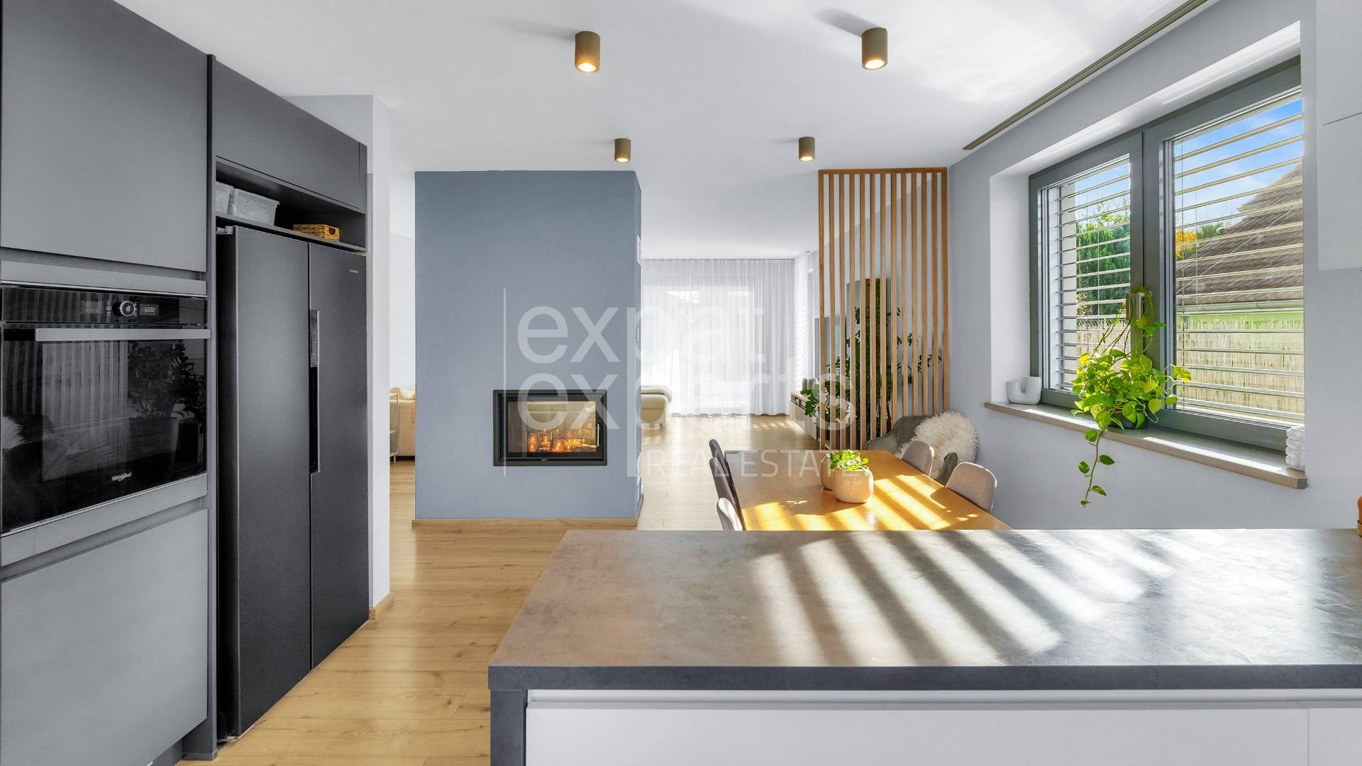 - obývaciu izbu od jedálne a kuchyne oddeľuje opticky teleso krbu aj lamelová stena,