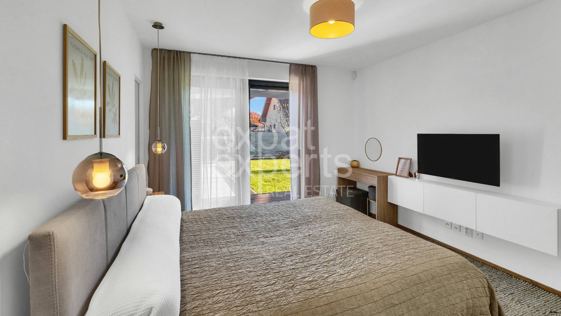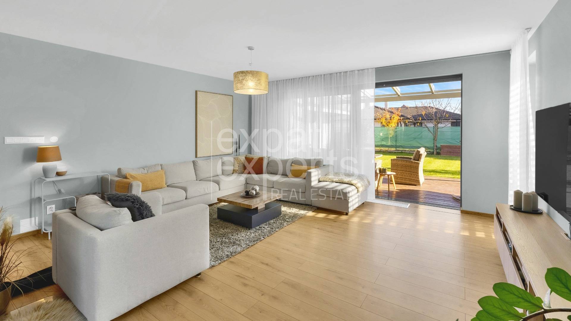 - priestranná miestnosť so širokými posuvnými terasovými dverami, s výhľadom do záhrady