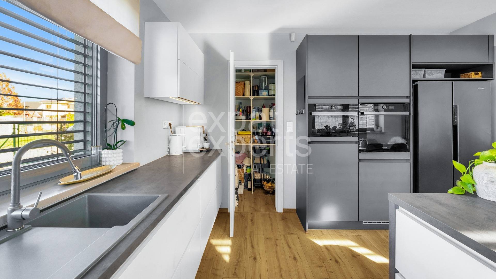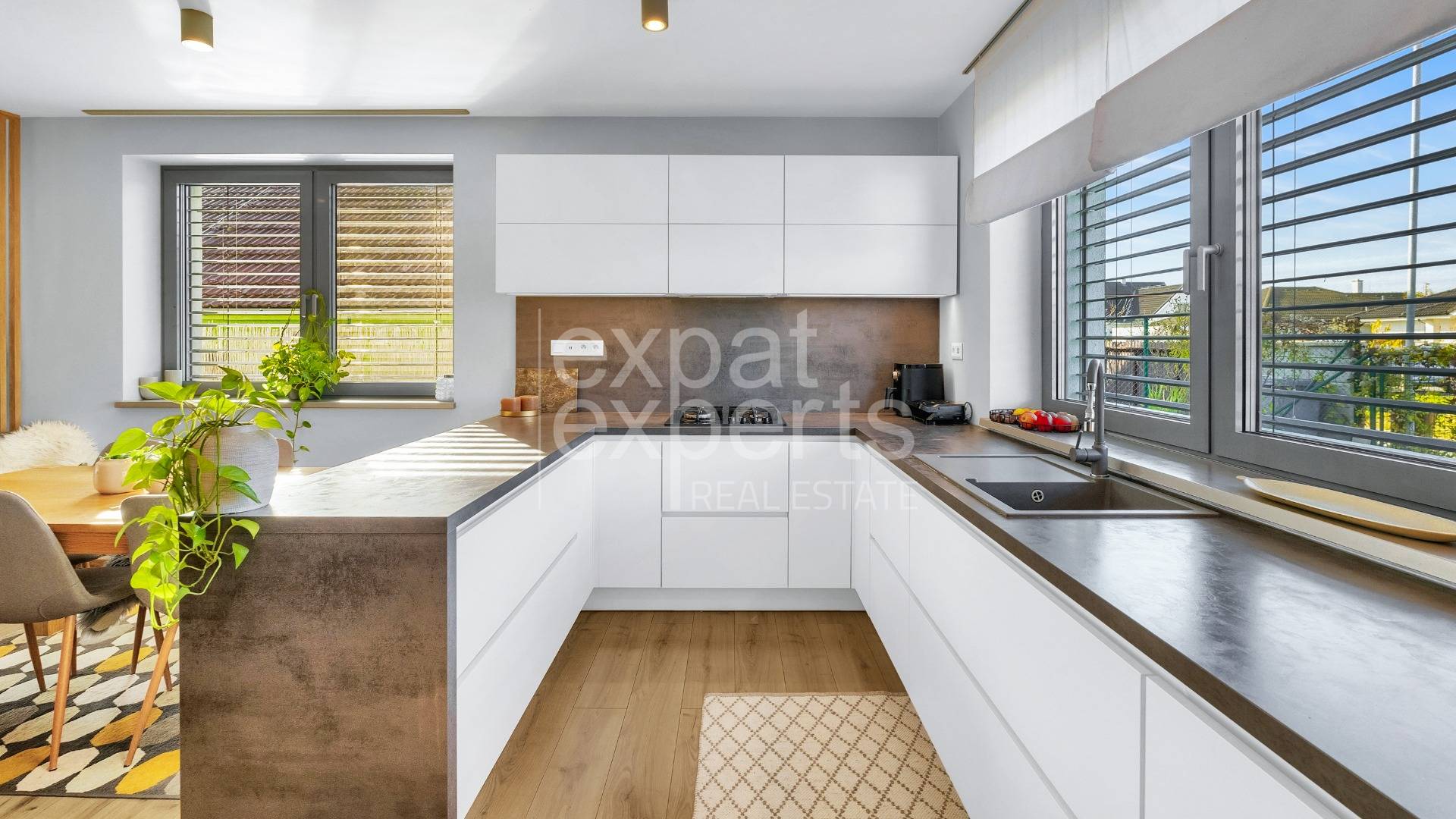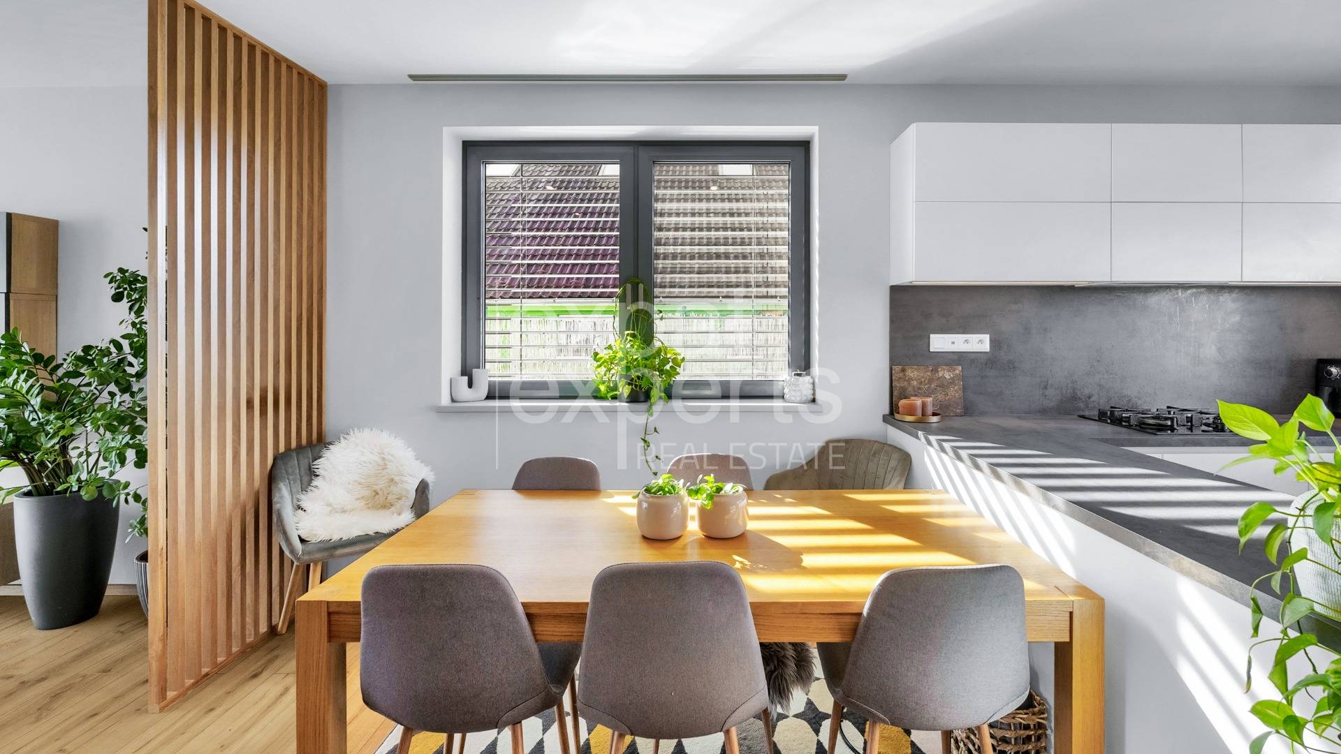- voľne prepojená miestnosť s obývacou izbou, s 2 veľkými oknami smer západ a sever, výhľad z kuchyne do predzáhradky a do parčíku,